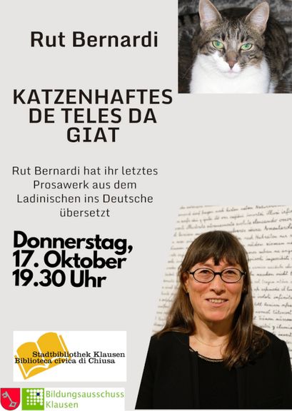 Rut Bernardi hat ihr letztes Prosawerk aus dem Ladinischen ins Deutsche übersetzt. Sie präsentiert ihr Werk "De teles da giat - Katzenhaftes" am Donnerstag, den 17. Oktober, um 19.30 Uhr in der Stadtbibliothek Klausen.